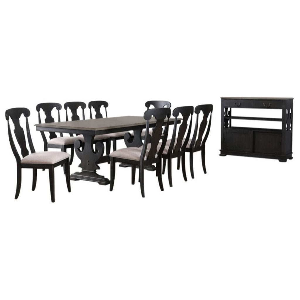 Frates 10 Piece Extendable Dining Set, Black & Brown Wood (Table, 8 Chairs, Server). Mix A Dash Of Modern Farmhouse Flair Into Your Dining Room Or Eat-In Kitchen With This Frates Extendable Dining Set. Founded Atop A Distinct Trestle Base With Its Butterfly Extension Rectangular Top That Can Extend The Table Up To 84 Long To Seat Eight Comfortably While The Full-Back Chairs Feature A Distinctive Fiddle Design And Square Polyester Seats That Sit On Top Of Four Tapered Legs, Giving Your Space A Hint Of Classic Style. Constructed From Solid Wood, And Sports A Black And Brown Finish Thats Versatile Enough To Blend With Most Color Palettes. The Buffet Is A Versatile Piece Featuring Two Drawers Up Top And A Sliding Door Cabinet Down Below Perfect For Tucking Away Clutter While Center Open Shelves Allow You To Easily Access Your Favorite Cooking Implements And Keep Your Favorite Bottles In Easy Reach.