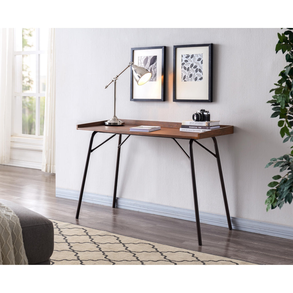 Fusion Home Office Writing Computer Desk, Walnut Wood & Bronze Metal, Industrial Style. Whether You Are Working On Your Laptop Or Writing Thank You Notes To Family And Friends Youll Love The Ample Workspace Of This Fusion Desk. Crafted Of Wood With Laminate Veneers, The Desktop Strikes A Clean-Lined Square Silhouette In A Walnut Finish With Lifted Side Frames And Sports Four Bronze Powder-Coated Finished Metal Flared Legs Complete The Design.Key Features:Finish: Walnut Desktop; Bronze Legs; Black Hardwarematerials: Wood & Veneer Desktop; Metal Legsoverall Weight: 24 Lbsoverall Dimensions: 45W X 20.5D X 31Hdesktop Size: 45W X 20.5Dspace Between The Legs: 45W X 18D X 29Hfelt Fads Beneath Legs To Prevent Floor Scratchingassembly Required