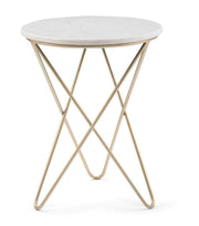 This accent table is handcrafted using solid marble for the top and metal for the legs, featuring a durable gold powder-coated finish.