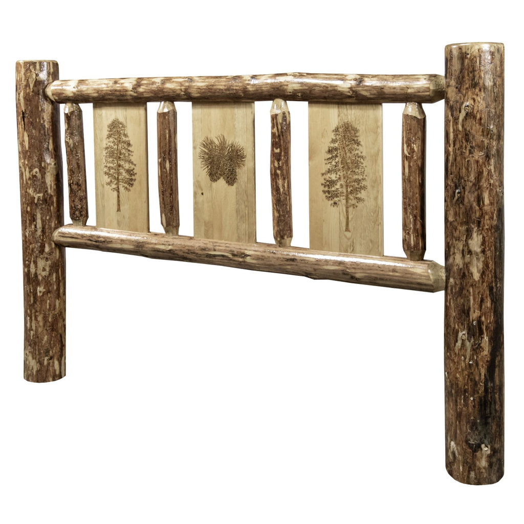 This headboard has a three-panel design with laser-engraved details that showcase a pine tree motif, emphasizing a rustic aesthetic.