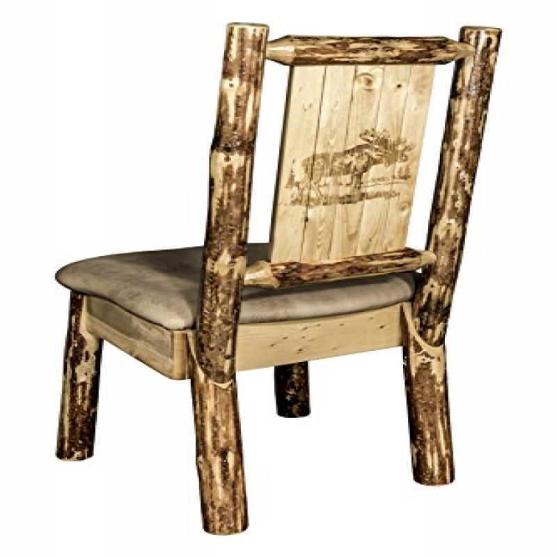 A Perfect Fit At The Dining Table, At A Desk Or Any Place Where A Robust Yet Comfortable Chair May Be Required, This Side Chair Incorporates A Rustic Themed, Laser Engraved Moose Motif On The Back. Hand Crafted Using The Tried And True Mortise And Tenon Joinery System That Has Served As A Symbol Of Durability For Millennia, This Chair Is As Strong As It Is Unique. Seat Height Is 18. Seat Width Is 18.5. Seat Depth Is 17. Capacity 350 Pounds. This Model Features An Upholstered Seat In The Buckskin Pattern. Fully Assembled. Finished In The Glacier Country Collection Style For A Truly Unique, One-Of-A-Kind Look Reminiscent Of The Grand Lodges Of The Rockies, Circa 1900. First We Remove The Outer Bark While Leaving The Inner, Cambium Layer Intact For Texture And Contrast. Then The Finish Is Completed In An Eight Step, Professional Spraying Process That Applies Stain And Lacquer For A Beautiful, Long Lasting Finish. All Montana Woodworks Products Come With A Hand Crafted In Montana U.S.A. Using Genuine Lodge Pole Pine!