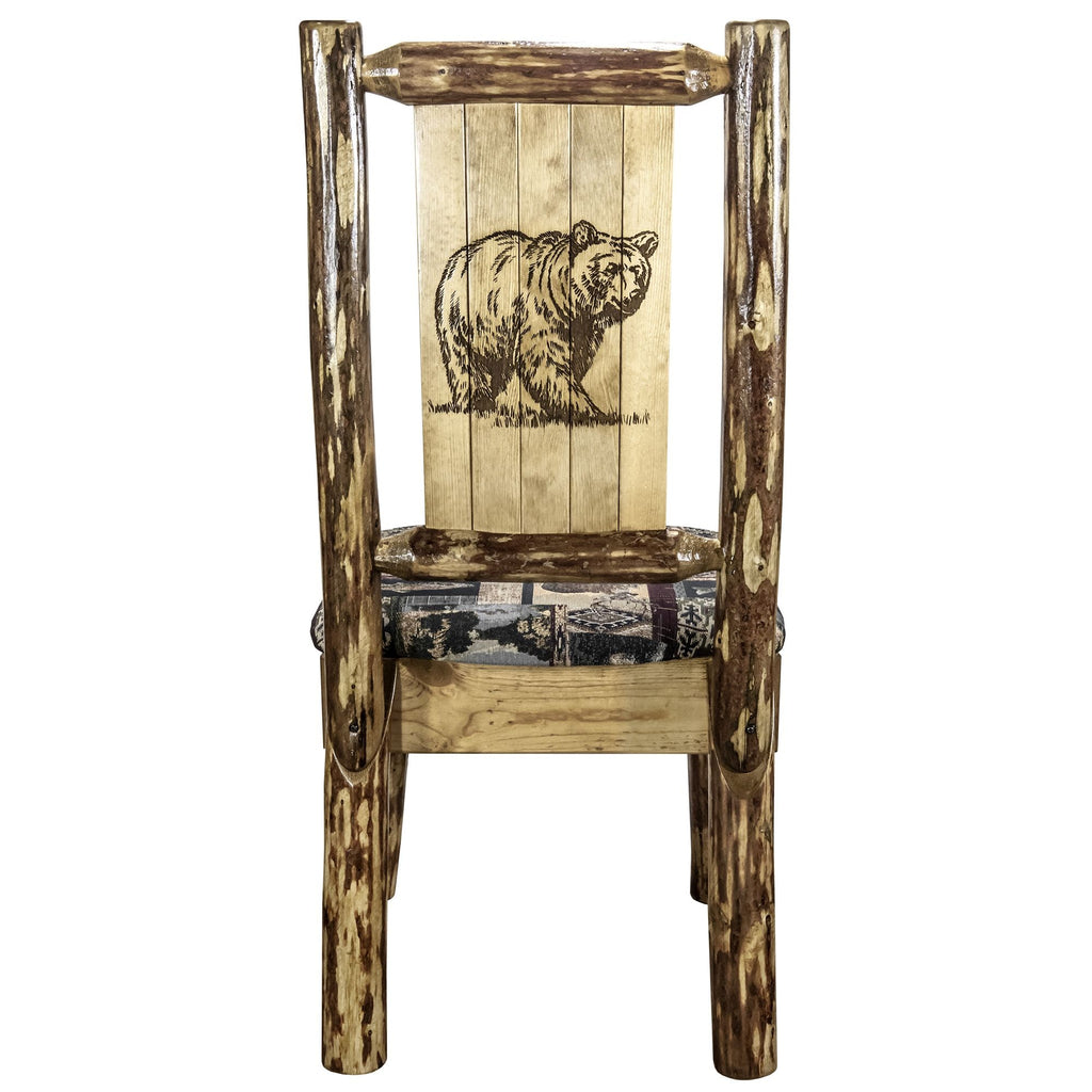 A Perfect Fit At The Dining Table, At A Desk Or Any Place Where A Robust Yet Comfortable Chair May Be Required, This Side Chair Incorporates A Rustic Themed, Laser Engraved Bear Motif On The Back. Hand Crafted Using The Tried And True Mortise And Tenon Joinery System That Has Served As A Symbol Of Durability For Millennia, This Chair Is As Strong As It Is Unique. Seat Height Is 18. Seat Width Is 18.5. Seat Depth Is 17. Capacity 350 Pounds. This Model Features An Upholstered Seat In The Woodland Pattern. Fully Assembled. Finished In The Glacier Country Collection Style For A Truly Unique, One-Of-A-Kind Look Reminiscent Of The Grand Lodges Of The Rockies, Circa 1900. First We Remove The Outer Bark While Leaving The Inner, Cambium Layer Intact For Texture And Contrast. Then The Finish Is Completed In An Eight Step, Professional Spraying Process That Applies Stain And Lacquer For A Beautiful, Long Lasting Finish. All Montana Woodworks Products Come With Hand Crafted In Montana U.S.A. Using Genuine Lodge Pole Pine!