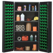 The STORAGE CABINET W/96 GREEN BINS has dimensions that are ideal for various storage needs, providing ample space for organization.