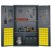 The GRAY STORAGE CABINET comes with 64 blue bins included for organized storage.