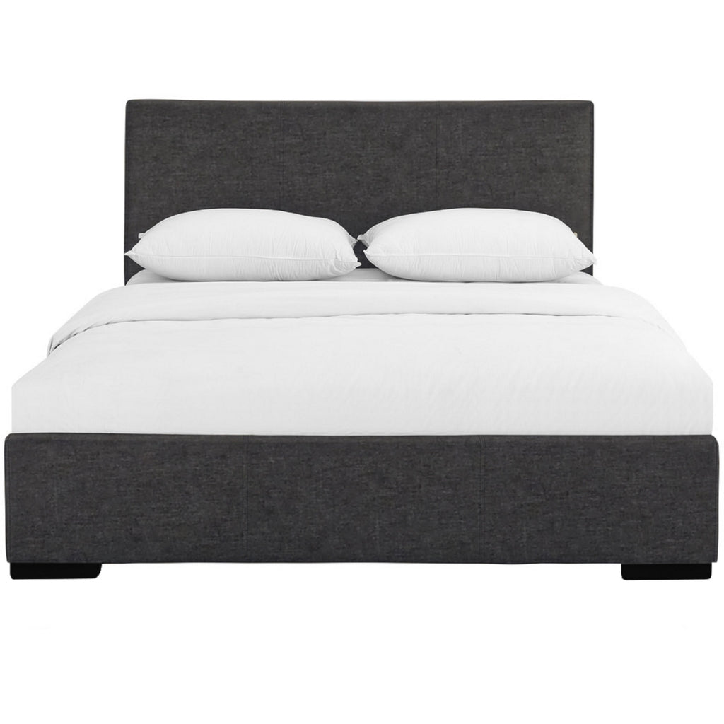 The bed frame is upholstered in polyester fabric and features wooden slats for support.