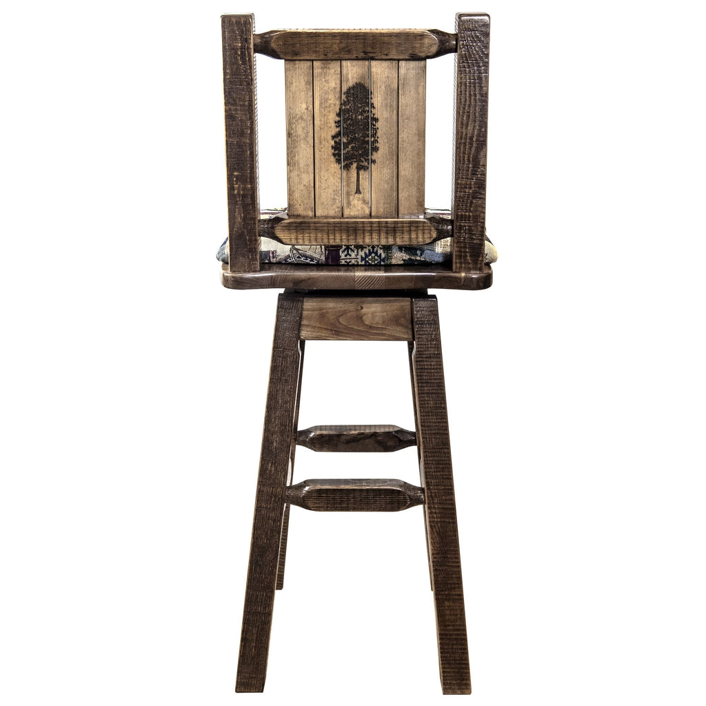 This Swivel Barstool Combines A Durable Swivel Mechanism With A Rustic Themed, Laser Engraved Pine Tree Motif On The Back For An Awesome Combination Of Functionality And Stylish Design. The Artisans At Montana Woodworks Use Only Solid, American Grown Wood And The Durable, Millennia Old Mortise And Tenon Joinery System To Ensure You Will Own A Truly Heirloom Quality Item. Seat Height Is 30. Seat Width Is 18.5, Seat Depth Is 16. Legs, Back And Cross Supports Are Square Sawn For A Look Uniquely Reminiscent Of The Timber-Framed Homes Once Found On The American Frontier. This Barstool Comes With An Upholstered Seat In The Woodland Pattern. Fully Assembled. Capacity 350 Pounds. Comes Professionally Finished With Premium Grade Stain And Semi-Gloss Clear Lacquer. All Montana Woodworks Products Come With Hand Crafted In Montana U.S.A. Using Genuine Lodge Pole Pine!