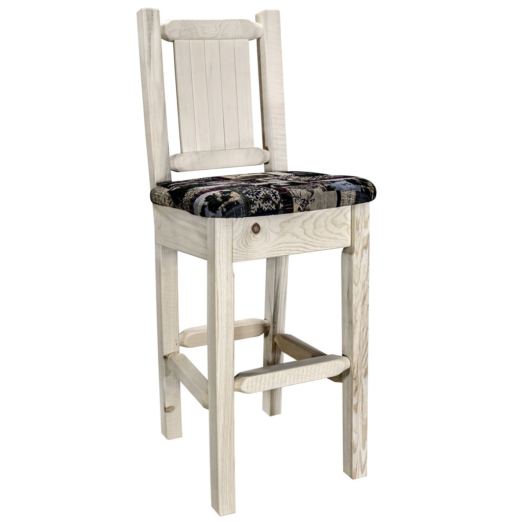 This Barstool With Back Features A Laser Engraved Bear Motif And Is Handcrafted Using Solid, American Grown Wood. Seat Height Is 30, Perfect For Most Bars, Bistro And Pub Tables. Seat Width Is 18.5, Seat Depth Is 17. The Seat, Legs And Cross Supports Are Square Sawn For A Look Uniquely Reminiscent Of The Timber-Framed Homes Once Found On The American Frontier. This Model Features An Upholstered Seat In The Woodland Pattern. Capacity 350 Pounds. Fully Assembled. This Item Is Sold Ready To Finish. Apply Your Favorite Lacquer Or Stain And Lacquer To Match Existing Decor. All Montana Woodworks Products Come With Hand Crafted In Montana U.S.A. Using Genuine Lodge Pole Pine!