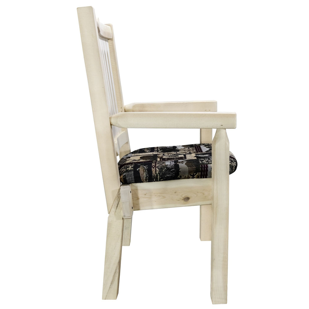 From Montana Woodworks, The Largest Manufacturer Of Handcrafted Quality Log Furnishings In America Comes The All New Homestead Collection Line Of Furniture Products. Handcrafted In The Mountains Of Montana Using Solid, American Grown Wood, The Artisans Rough Saw All The Timbers And Accessory Trim Pieces For A Look Uniquely Reminiscent Of The Timber-Framed Homes Once Found On The American Frontier. The Captain'S Chair By Montana Woodworks Is The Perfect Addition To Your Dining Set. Placed At The Head Of The Table Or Used All Around, These Chairs Are Sure To Please The Captain Of Your Table! Seat Height Is 18. Seat Width Is 18.5. Seat Depth Is 17. Capacity 350 Pounds. This Model Features The Comfy Upholstered Seat In The Woodland Pattern. Comes Fully Assembled. This Item Is Sold Ready To Finish I.E., It Is Ready For The Purchaser To Paint, Stain Or Stain And Lacquer.