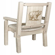 At The Head Of The Dining Table, At A Desk Or Any Place Where A Robust Yet Comfortable Chair May Be Required, This Captain'S Chair Incorporates A Rustic Themed, Laser Engraved Bear Motif On The Back. Hand Crafted Using The Tried And True Mortise And Tenon Joinery System That Has Served As A Symbol Of Durability For Millennia, This Chair Is As Strong As It Is Unique. Legs And Back Are Square Sawn For A Look Uniquely Reminiscent Of The Timber-Framed Homes Once Found On The American Frontier. Seat Height Is 18. Seat Width Is 18.5. Seat Depth Is 17. Capacity 350 Pounds. This Model Features The Standard, Ergonomically Designed Wooden Seat. Fully Assembled. This Item Is Sold Ready To Finish. Apply Your Favorite Lacquer Or Stain And Lacquer To Match Existing Decor. All Montana Woodworks Products Come With A Hand Crafted In Montana U.S.A. Using Genuine Lodge Pole Pine!