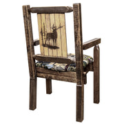 At The Head Of The Dining Table, At A Desk Or Any Place Where A Robust Yet Comfortable Chair May Be Required, This Captain'S Chair Incorporates A Rustic Themed, Laser Engraved Elk Motif On The Back. Hand Crafted Using The Tried And True Mortise And Tenon Joinery System That Has Served As A Symbol Of Durability For Millennia, This Chair Is As Strong As It Is Unique. Legs And Back Are Square Sawn For A Look Uniquely Reminiscent Of The Timber-Framed Homes Once Found On The American Frontier. Seat Height Is 18. Seat Width Is 18.5. Seat Depth Is 17. Capacity 350 Pounds. This Model Features An Upholstered Seat In The Woodland Pattern. Fully Assembled. Comes Professionally Finished With Premium Grade Stain And Semi-Gloss Clear Lacquer. All Montana Woodworks Products Come With Hand Crafted In Montana U.S.A. Using Genuine Lodge Pole Pine!