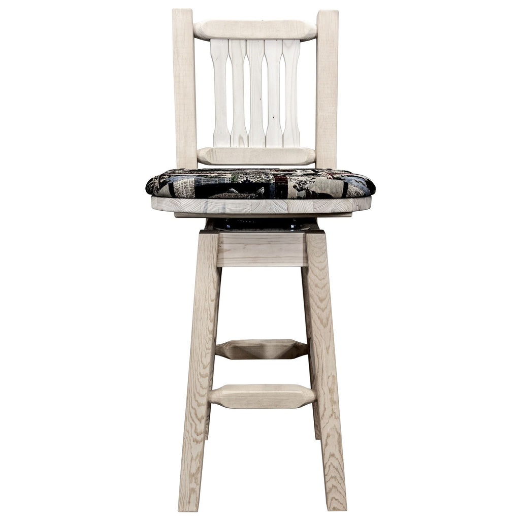 This Counter Height Swivel Barstool Combines A Durable Swivel Mechanism With An Ergonomic Back For An Awesome Combination Of Functionality And Comfort. The Artisans At Montana Woodworks Use Only Solid, American Grown Wood And The Durable, Millennia Old Mortise And Tenon Joinery System To Ensure You Will Own A Truly Heirloom Quality Item. Seat Height Is 24. Seat Width Is 18.5, Seat Depth Is 16. Legs, Back And Cross Supports Are Square Sawn For A Look Uniquely Reminiscent Of The Timber-Framed Homes Once Found On The American Frontier. This Barstool Comes With An Upholstered Seat In The Woodland Pattern. Fully Assembled. Capacity 350 Pounds. Comes Professionally Finished With Premium Grade, Semi-Gloss Clear Lacquer. Hand Crafted In Montana U.S.A. Using Genuine Lodge Pole Pine!