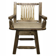 This Counter Height Captain'S Style Barstool With Swivel Features Solid, Genuine Lodge Pole Pine Construction And Is Created Using The Tried And True Mortise And Tenon Joinery System For True Heirloom Quality And Rugged Durability. The Legs, Back And Cross Supports Are Square Sawn For A Look Uniquely Reminiscent Of The Timber-Framed Homes Once Found On The American Frontier. This Barstool Features An Upholstered Seat In The Buckskin Pattern. Seat Height: 24. Seat Width Is 19 Seat Depth Is 17. Fully Assembled. Capacity 350 Pounds. Comes Professionally Finished With Premium Grade Stain And Semi-Gloss Clear Lacquer. All Montana Woodworks Products Come With A Hand Crafted In Montana U.S.A.