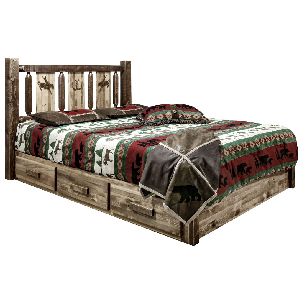 Homestead Collection Platform Bed W/ Storage, Queen W/ Laser Engraved Bronc Design, Stain & Clear Lacquer Finish
