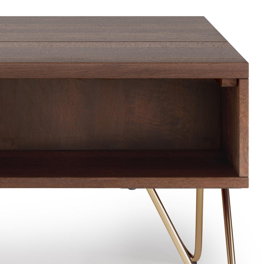 The SIMPLIHOME Hunter Coffee Table features an industrial design, characterized by its hairpin legs and rich wood finish.