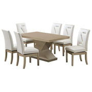 Legault 7 Piece Pedestal Dining Set, White Vinyl & Gold Wood (Table, 6 Chairs)