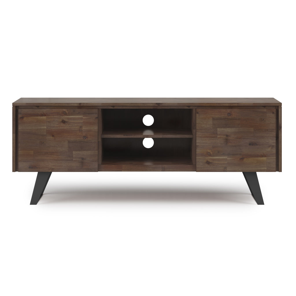 The TV stand is hand-finished in a Rustic Natural Aged Brown color, which enhances the unique grain of the Acacia wood.