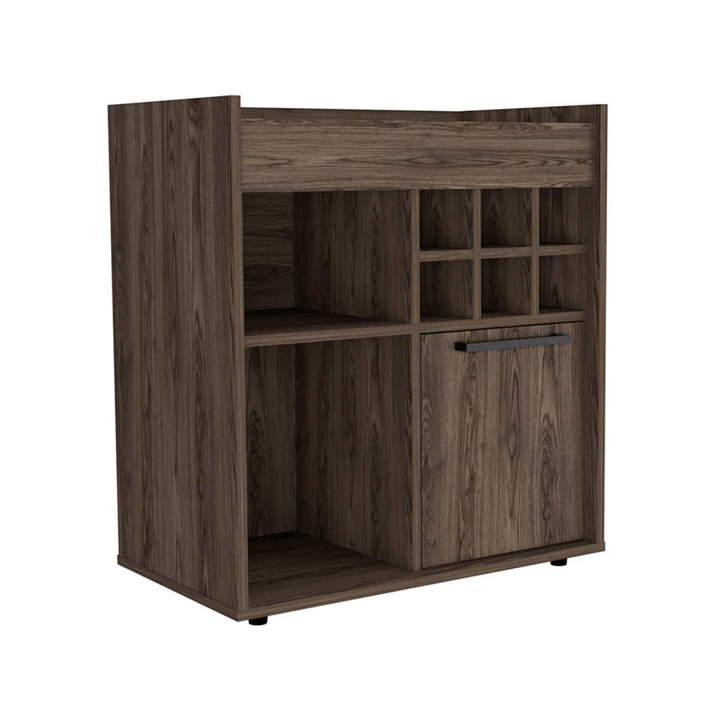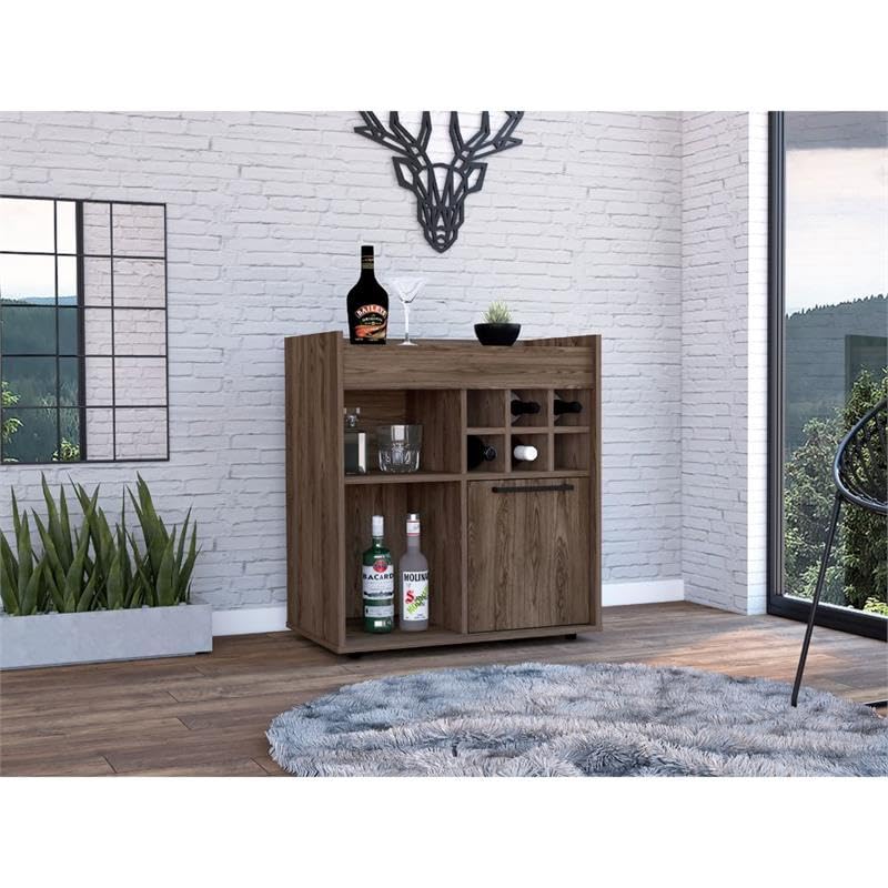The Tuhome Lyon Bar Cabinet Is The Most Super Complement To Your Entertainment Spirit. It'S Designed To Be A Multifunctional, Modern Piece That Will Be The Highlight Of Your Dining Room Or Living Room. Its Size Makes It Perfect For Rooms With Plenty Or Limited Space Available, And A Ton Of Features Will Provide You Everything You Need To Keep The Party Going, And Your Guest Entertained.Standing At 29.1 High, This Bar Cabinet Will Be Providing You A Place To Put Your Entertainment Essentials Without Taking Much Space. The Top Surface (26.7 W X 15.3 D) Is Great To Keep Handy Your More Frequent Items, To Prepare Your Drinks Or Mix Your Cocktails. Six Bottle Cubbies Are A Great Place To Store Your Wine Or Liquor, And Two Open Shelves Are Perfect For Keeping Your Glasses Ready To Use At Any Moment. A Bottom Cabinet With Two Interior Shelves Will Provide You The Concealed Storage Space For Those Items You May Need Handy But Want To Keep Out Of Sight.Product Dimensions Are 26.7 W X 15.3 D X 29.1 H. It Is Made In Particle Board In Dark Walnut Finish.