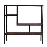 This bookshelf has three asymmetrical shelves, providing a staggered look for added dimension.