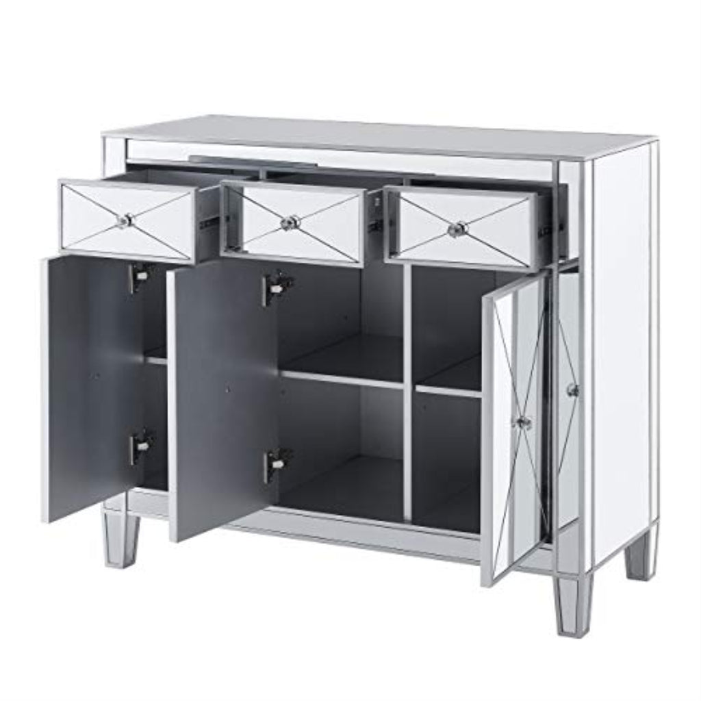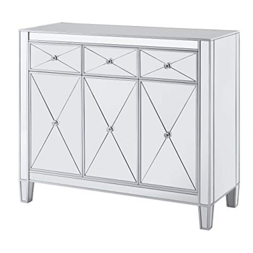The cabinet showcases a glam style with a mirrored finish and matte silver trim, reflecting Hollywood regency opulence.