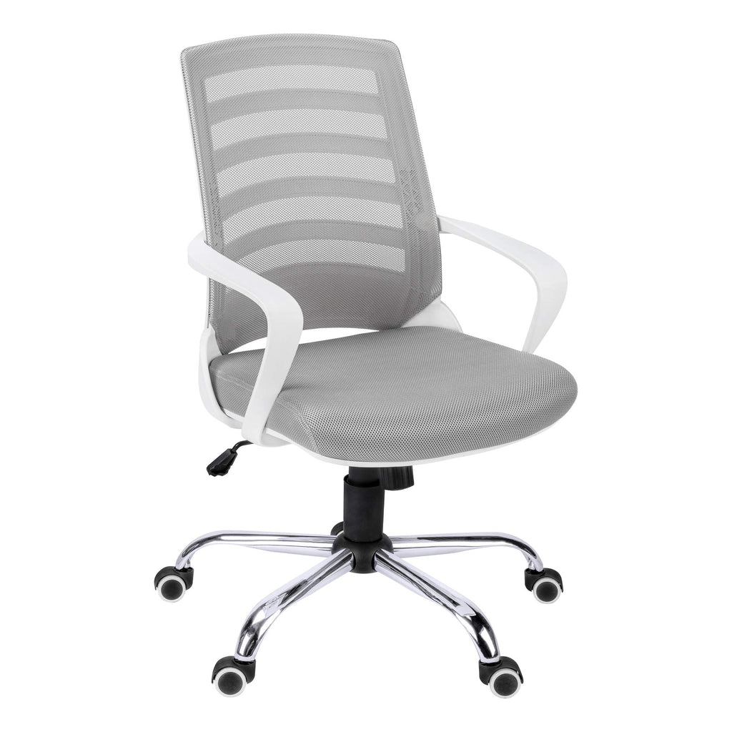 The chair is upholstered in durable grey mesh polyester fabric, which allows air circulation for added comfort.