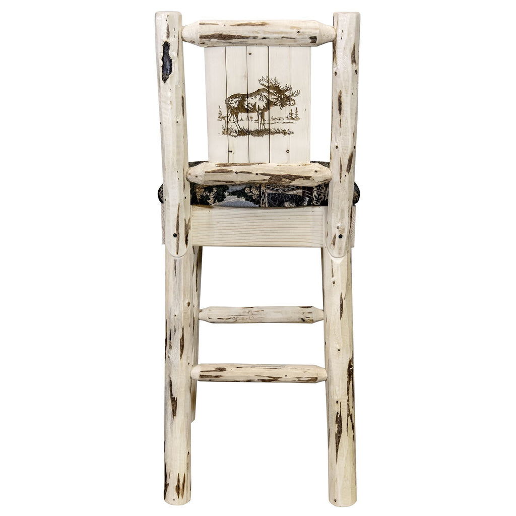 This Barstool With Back Features A Laser Engraved Moose Motif And Is Handcrafted Using Solid, American Grown Wood. Seat Height Is 30, Perfect For Most Bars, Bistro And Pub Tables. Seat Width Is 18.5, Seat Depth Is 17. Legs, Back And Cross Supports Are Skip Peeled By Hand Using Old-Fashioned Draw Knives To Create A Unique, One Of A Kind Appearance. This Model Features An Upholstered Seat In The Woodland Pattern. Capacity 350 Pounds. Fully Assembled. This Item Is Sold Ready To Finish. Apply Your Favorite Lacquer Or Stain And Lacquer To Match Existing Decor. All Montana Woodworks Products Come With Hand Crafted In Montana U.S.A. Using Genuine Lodge Pole Pine!