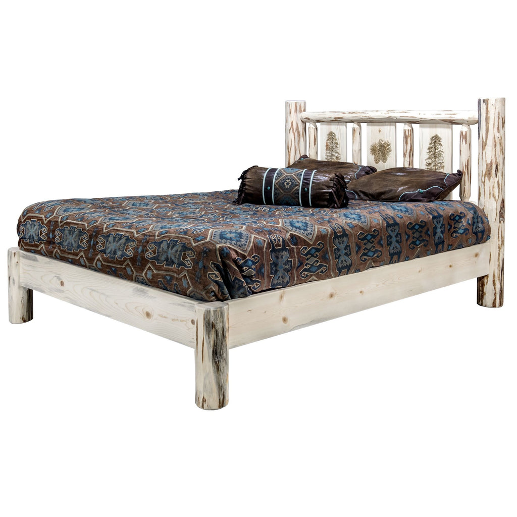 This Unique Platform Style Rustic Bed Features A Rustic Themed, Laser Engraved Three Panel Headboard With A Unique Pine Tree Motif And Is Perfect For The Master Or Guest Bedroom. Featuring A Low Height Footboard And Standard Height Headboard Plus Sideboards That Are As Sleek And Attractive As They Are Sturdy, This Bed Is Rated At A Capacity Of 550 Pounds. Full Length Steel L Brackets Support Wooden Cross Supports Which In Turn Support The Two Half Sheets Of Engineered Panel. Some Assembly Required. Hardware And Instructions Included. Hand Crafted In Montana U.S.A. Using Genuine Lodge Pole Pine!