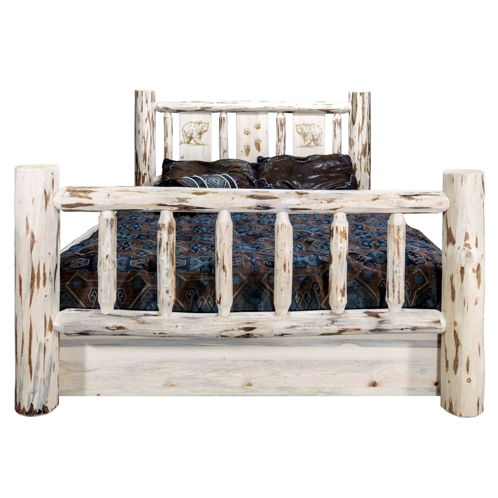 This Unique Spindle Style Log Bed With Storage Features A Rustic Themed, Laser Engraved Three Panel Headboard With A Unique Bear Motif. Six Full Sized, 21 Wide, 16 Deep, 5.5 High Dresser Drawers Mounted On Full Extension, Ball Bearing Glides Ensure Years Of Quiet, Trouble Free Use. Combining The Storage Capacity Of A 6 Drawer Dresser With The Durability And Attractiveness Of A Mortise And Tenon Style Bed Is A Sure Way To Add Rustic Elegance And Extra Storage Capacity To Your Bedroom. Comes Pre-Finished With A Factory Applied Premium Grade, Semi-Gloss, Clear Lacquer Finish. Some Assembly Required. Instructions And Hardware Included. 550 Pound Capacity. Handcrafted In Montana, U.S.A. Using Genuine Lodge Pole Pine!