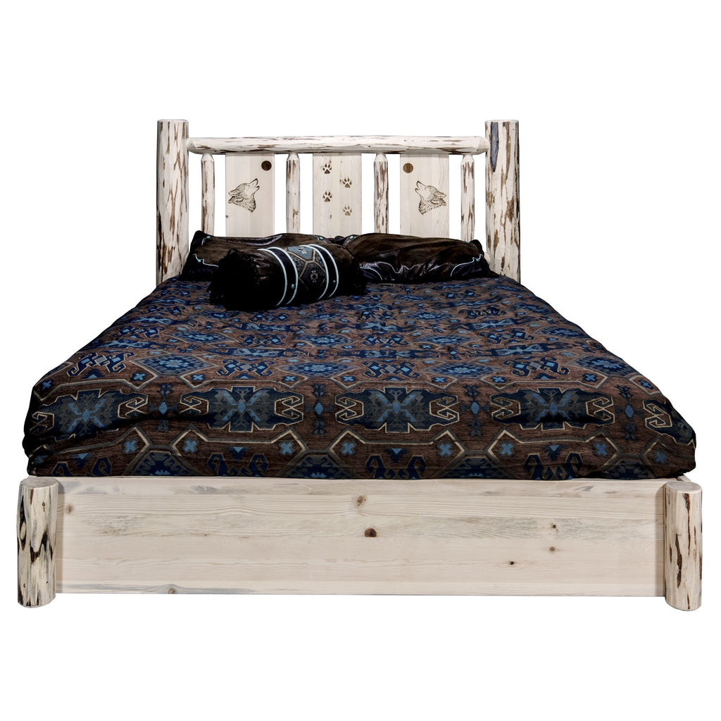 Montana Collection Platform Bed W/ Storage, Full W/ Laser Engraved Wolf Design, Clear Lacquer Finish