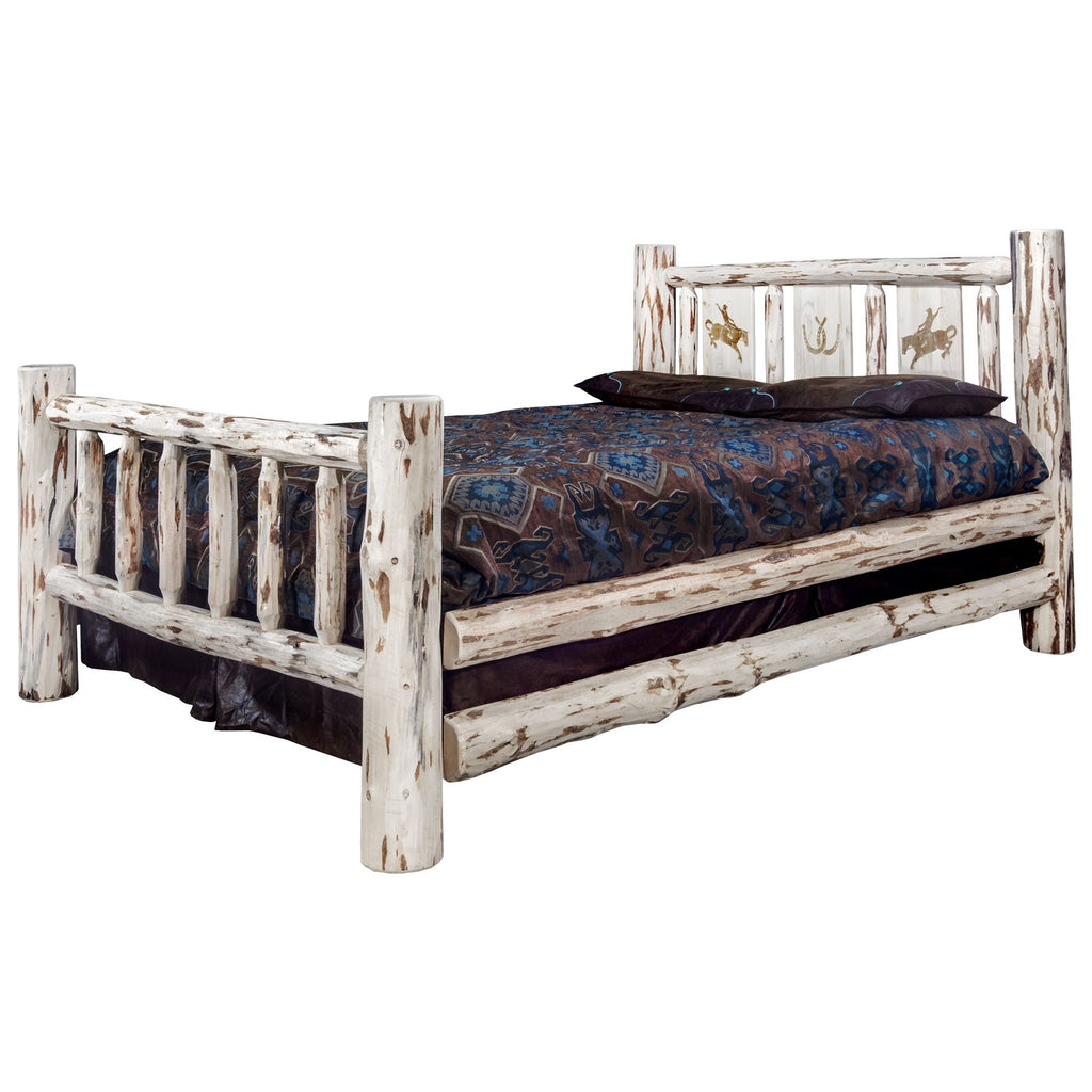 Featuring A Rustic Themed, Laser Engraved Three Panel Headboard With A Unique Bronc Motif, This Twin-Sized Spindle Style Log Bed Will Add A Sense Of Exceptional Style To Your Bedroom. Handcrafted In Montana Using Solid, American Grown Wood, Each Piece Is Skip Peeled By Hand Using Old-Fashioned Draw Knives For A Unique, One-Of-A-Kind Appearance. The Mortise And Tenon Joinery System Employed By Our Artisans Has Been Used For Millennia To Join Multiple Components Into A Single, Solid And Strong Assembly Thus Ensuring A Truly Heirloom Quality Piece That Will Last For Generations To Come. Two Log Side Rails Per Side Increase The Strength And Rigidity While Simultaneously Adding Value. Some Assembly Required. 550 Pound Capacity. Hand Crafted In Montana U.S.A. Using Genuine Lodge Pole Pine!