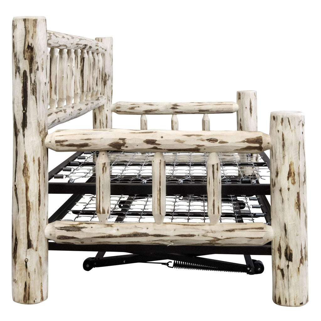The day bed is handcrafted from genuine lodge pole pine, ensuring durability and a unique, rustic appearance.