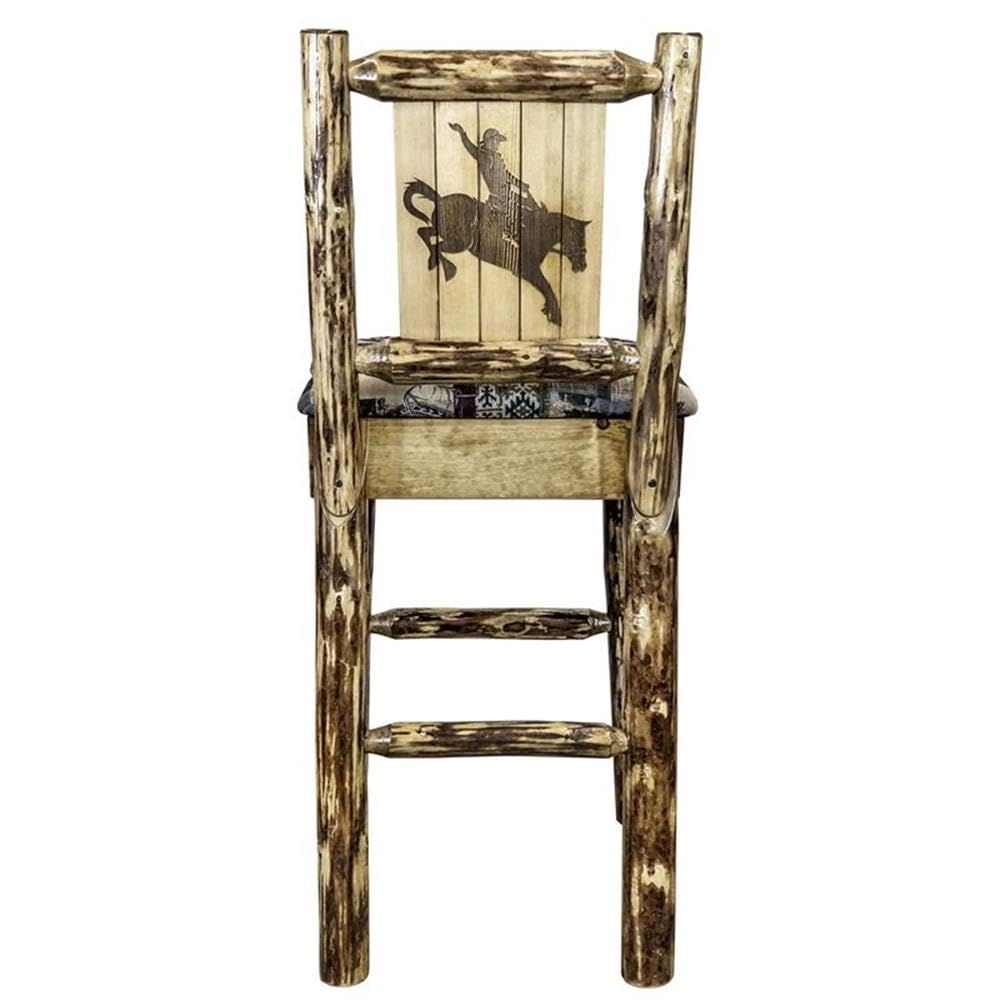 This Barstool With Back Features A Laser Engraved Bronc Motif And Is Handcrafted Using Solid, American Grown Wood. Seat Height Is 30, Perfect For Most Bars, Bistro And Pub Tables. Seat Width Is 18. 5, Seat Depth Is 17. This Model Features An Upholstered Seat In The Woodland Pattern. Capacity 350 Pounds. Fully Assembled. Finished In The Glacier Country Collection Style For A Truly Unique, One-Of-A-Kind Look Reminiscent Of The Grand Lodges Of The Rockies, Circa 1900. First We Remove The Outer Bark While Leaving The Inner, Cambium Layer Intact For Texture And Contrast. Then The Finish Is Completed In An Eight Step, Professional Spraying Process That Applies Stain And Lacquer For A Beautiful, Long Lasting Finish. All Montana Woodworks Products Come With A 20-Year Limited Included At No Additional Charge. Hand Crafted In Montana U. S. A. Using Genuine Lodge Pole Pine!
