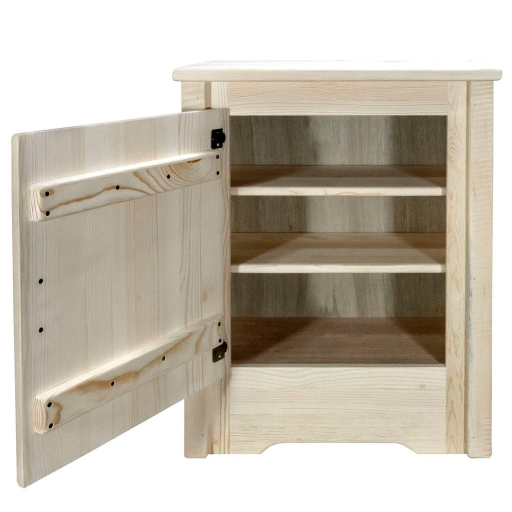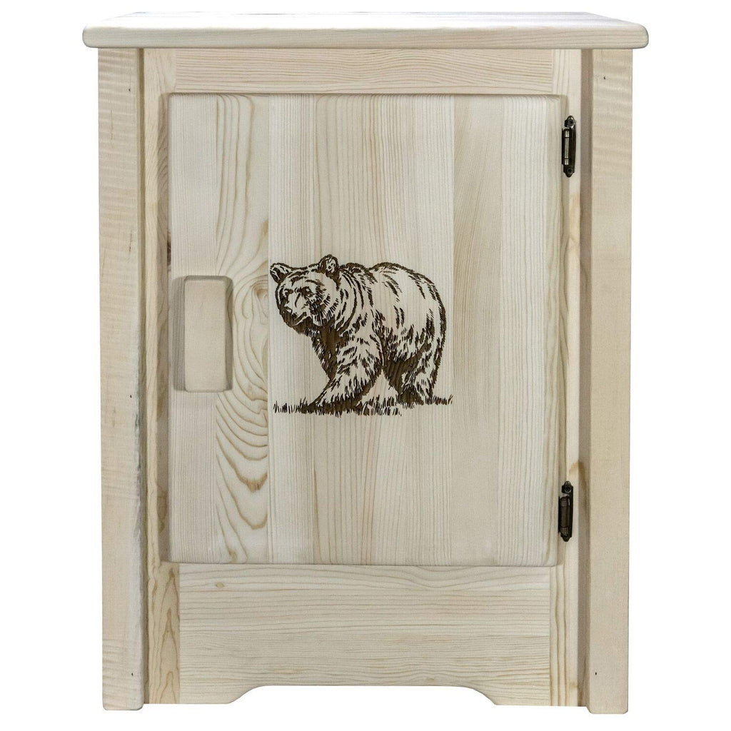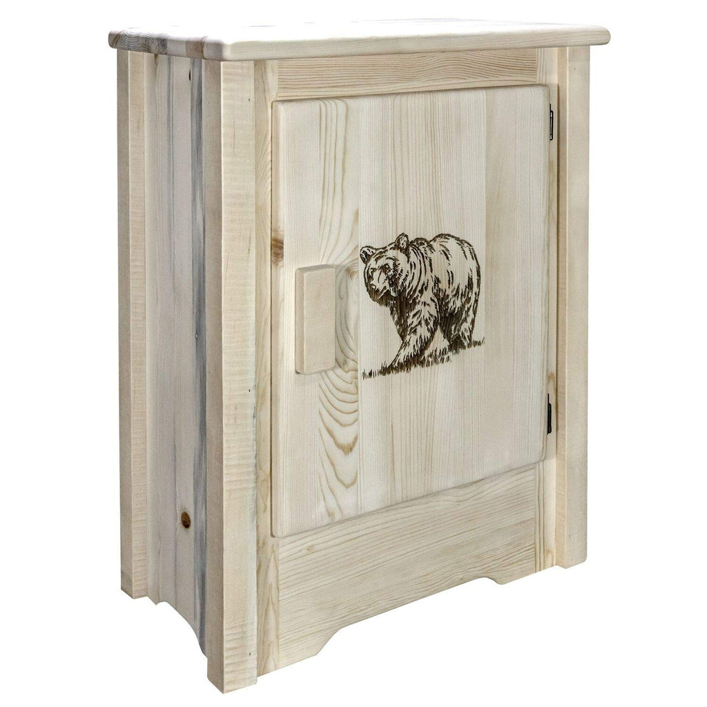 This Multipurpose Accent Cabinet From Montana Woodworks Features Two Fully Adjustable Shelves In A Storage Area The Measures 23 Inches High, 19 Inches Wide And 10 Inches Deep. Shelves Adjust In 1. 25 Inch Increments And Are Held In Place By Brass Hardware. This Item Features A Right Hinged, Raised Panel Door Featuring A Rustic Themed, Laser Engraved Bear Design. Handcrafted In The Mountains Of Montana Using Solid, American Grown Wood, The Artisans Rough Saw All The Timbers And Accessory Trim Pieces For A Look Uniquely Reminiscent Of The Timber-Framed Homes Once Found On The American Frontier. Comes Fully Assembled. This Item Comes With A Factory Applied, Premium Grade Semi-Gloss Clear Lacquer Finish. All Montana Woodworks Products Come With A 20-Year Limited Included At No Additional Charge. Hand Crafted In Montana U. S. A. Using Genuine Lodge Pole Pine!