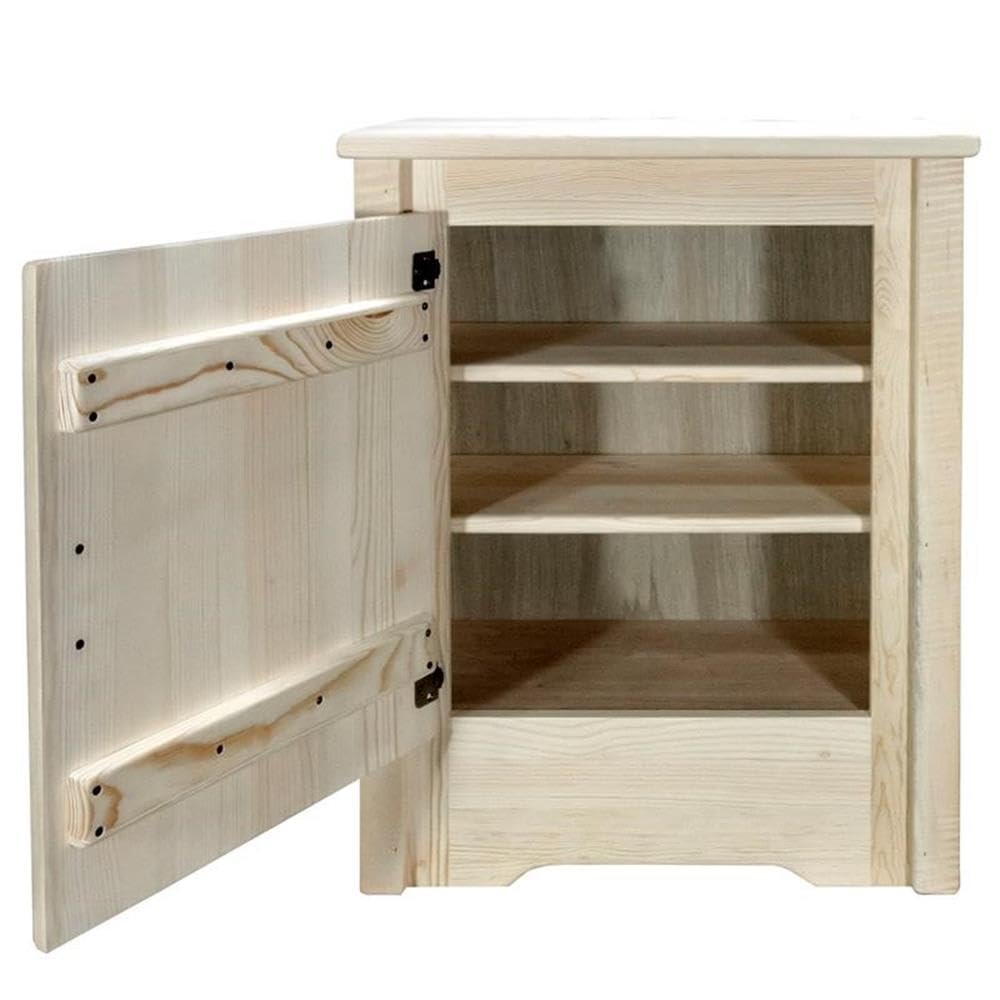 This Multipurpose Accent Cabinet From Montana Woodworks Features Two Fully Adjustable Shelves In A Storage Area The Measures 23 Inches High, 19 Inches Wide And 10 Inches Deep. Shelves Adjust In 1. 25 Inch Increments And Are Held In Place By Brass Hardware. This Item Features A Right Hinged, Raised Panel Door Featuring A Rustic Themed, Laser Engraved Bronc Design. Handcrafted In The Mountains Of Montana Using Solid, American Grown Wood, The Artisans Rough Saw All The Timbers And Accessory Trim Pieces For A Look Uniquely Reminiscent Of The Timber-Framed Homes Once Found On The American Frontier. Comes Fully Assembled. This Item Is Sold Ready To Finish I. E. , It Is Ready For The Purchaser To Paint, Stain Or Stain And Lacquer To Match Existing Decor. All Montana Woodworks Products Come With A 20-Year Limited Included At No Additional Charge. Hand Crafted In Montana U. S. A. Using Genuine Lodge Pole Pine!
