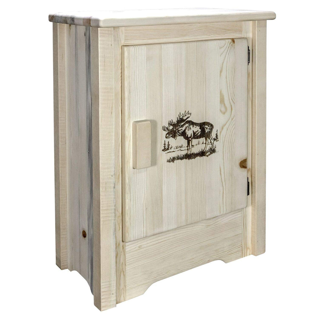 This Multipurpose Accent Cabinet From Montana Woodworks Features Two Fully Adjustable Shelves In A Storage Area The Measures 23 Inches High, 19 Inches Wide And 10 Inches Deep. Shelves Adjust In 1. 25 Inch Increments And Are Held In Place By Brass Hardware. This Item Features A Right Hinged, Raised Panel Door Featuring A Rustic Themed, Laser Engraved Moose Design. Handcrafted In The Mountains Of Montana Using Solid, American Grown Wood, The Artisans Rough Saw All The Timbers And Accessory Trim Pieces For A Look Uniquely Reminiscent Of The Timber-Framed Homes Once Found On The American Frontier. Comes Fully Assembled. This Item Comes With A Factory Applied, Premium Grade Semi-Gloss Clear Lacquer Finish. All Montana Woodworks Products Come With A 20-Year Limited Included At No Additional Charge. Hand Crafted In Montana U. S. A. Using Genuine Lodge Pole Pine!