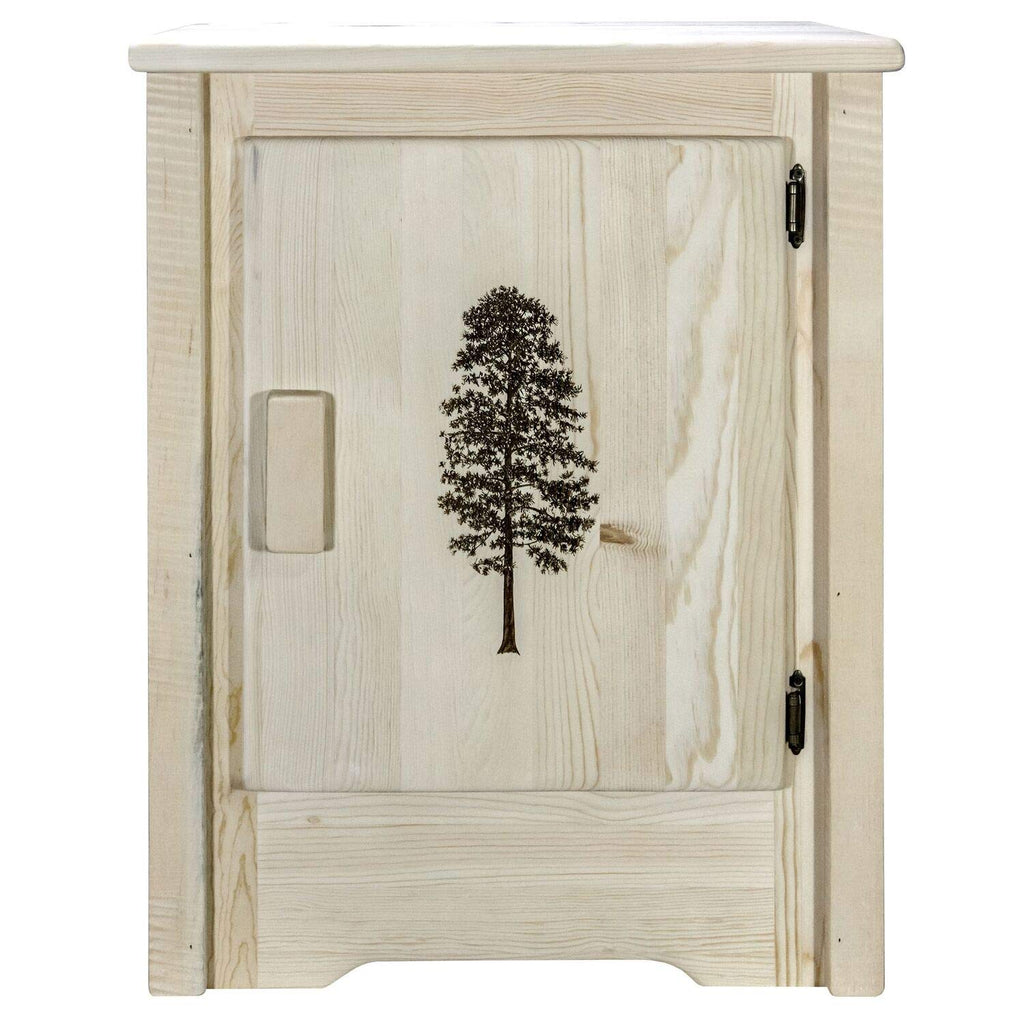 The cabinet features a right hinged, raised panel door with a rustic-themed, laser engraved pine design.