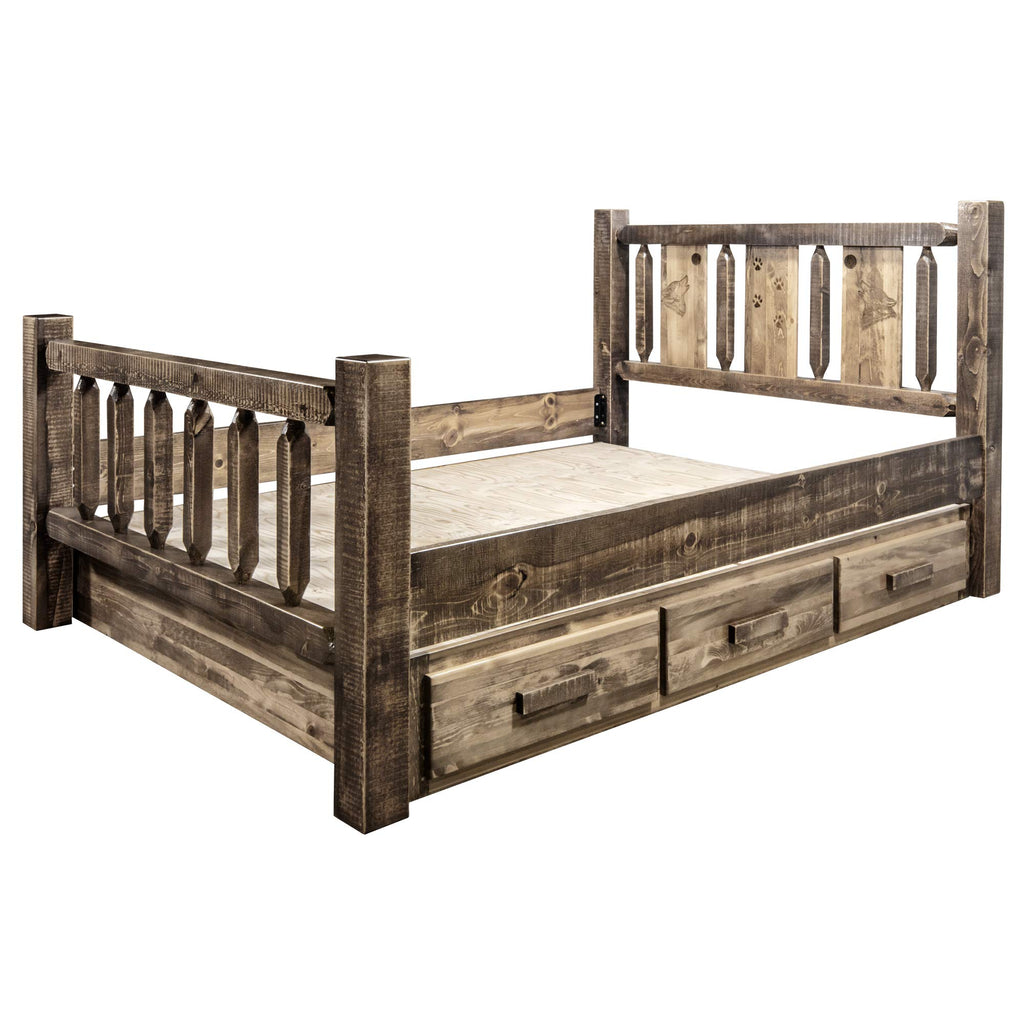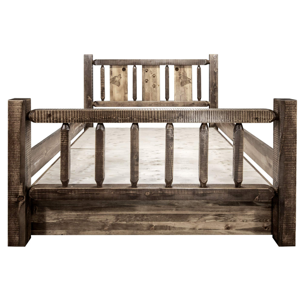 Montana Woodworks Homestead Collection Queen Storage Bed With Laser Engraved Wolf Design, Stain & Clear Lacquer Finish
