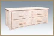 The Four Drawer Sitting Chest From The Homestead Collection Features The Same Storage Space As A Four Drawer Chest Of Drawers While Also Providing A Sleek, Low Profile Look. Used At The Foot Of The Bed It'S An Excellent Place To Sit While Taking Off Shoes, Socks, Etc. Hand Crafted In Montana Using Genuine Lodge Pole Pine. The Spacious Drawers Feature Epoxy Coated Steel Glides. Trim And Drawer Pulls Are Square Sawn For A Unique Timber Frame/Barn Wood Appearance. This Item Is Sold Ready To Finish So You Can Match Existing Decor And Colors; Simply Lacquer Or Stain And Lacquer To Match. Comes Fully Assembled. 20-Year Limited Manufacturer'S Warranty Included.