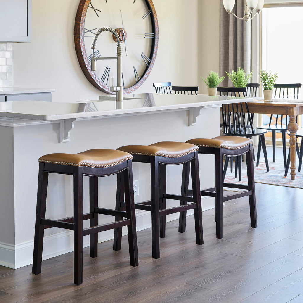 The barstool is made of solid hardwood with a comfortable vegan leather saddle seat.