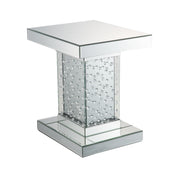 This end table features a contemporary style with mirrored finishes and faux crystal accents, making it suitable for modern and chic interior decor.