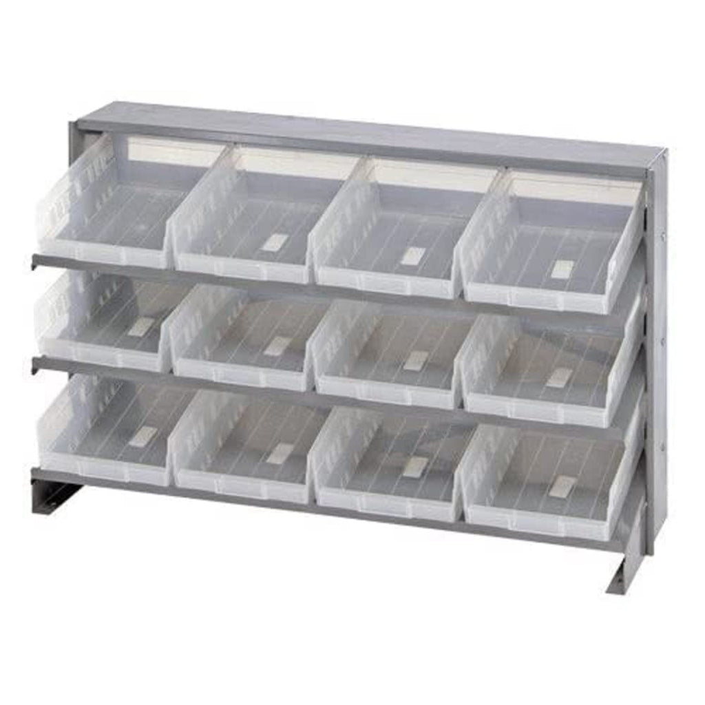 This storage system includes 12 clear bins, each measuring 11-5/8 inches in length, 8-3/8 inches in width, and 4 inches in height.