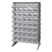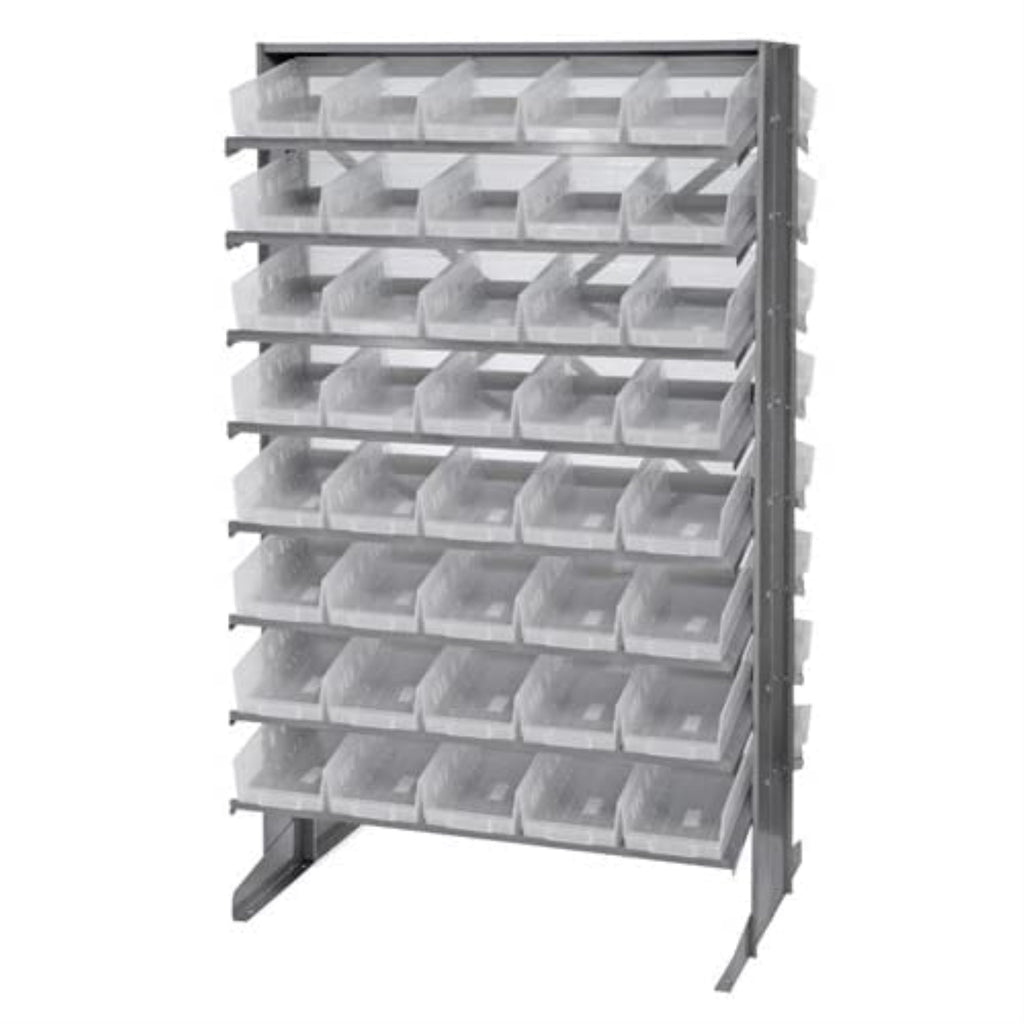 Pick Rack Provides A Convenient High Density, Easy Access, Sloped Shelving System. Unit Comes Complete With Plastic Shelf Bins. Sloped Shelving Unit Keeps Small And Medium Sized Parts Easily Accessible. Open Hopper Front Bins With Label Area, Provide Fast Access To Stored Items. This All-In-One Unit Is Easy To Clean And Will Not Rust Or Corrode. 24 X 36 X 60 Pick Rack Includes 80 Qsb102 Clear Bins.