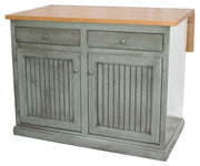The kitchen island is made from poplar wood with an oak top, combining quality materials for both aesthetic appeal and functionality.