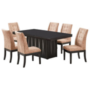Riley 7 Piece Modern Pedestal Dining Set, Cappuccino Wood & Light Brown Fabric (Table & 6 Upholstered Parsons Chairs). Although The Focus Is Quite Often On The Spread Of Food On The Dining Table, Your Choice Of Dining Furniture Can Make An Impact On Guests As Well. Choose The Riley Modern Dining Set To Bring A Stylish Touch To Your Eating Space, With Comfort To Last Long After Dessert Has Been Cleared. Crafted From Manufactured Wood, The Table Strikes A Clean-Lined Silhouette And Boasts A Dark Cappuccino Finish Thats Versatile Enough To Blend With Nearly Any Color Palette While The Chairs Showcase A Curved Silhouette And Are Wrapped In Polyester Fabric Upholstery With A Rectangular Design And Button Tuffs For A Touch Of Upscale Elegance.