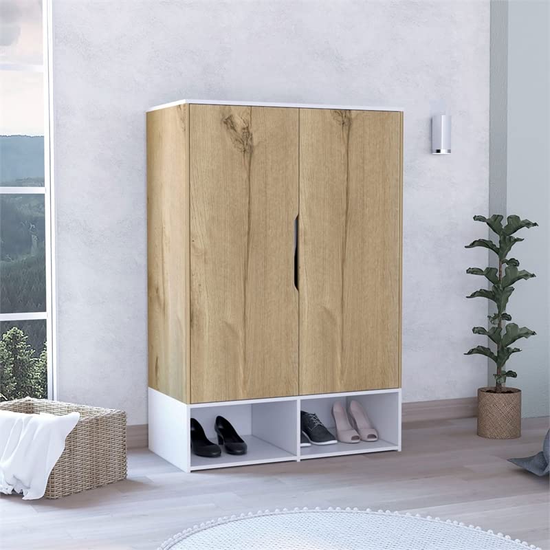 The TUHOME Rosie Armoire is available in a Light Oak-White finish, which complements modern and contemporary home decor.