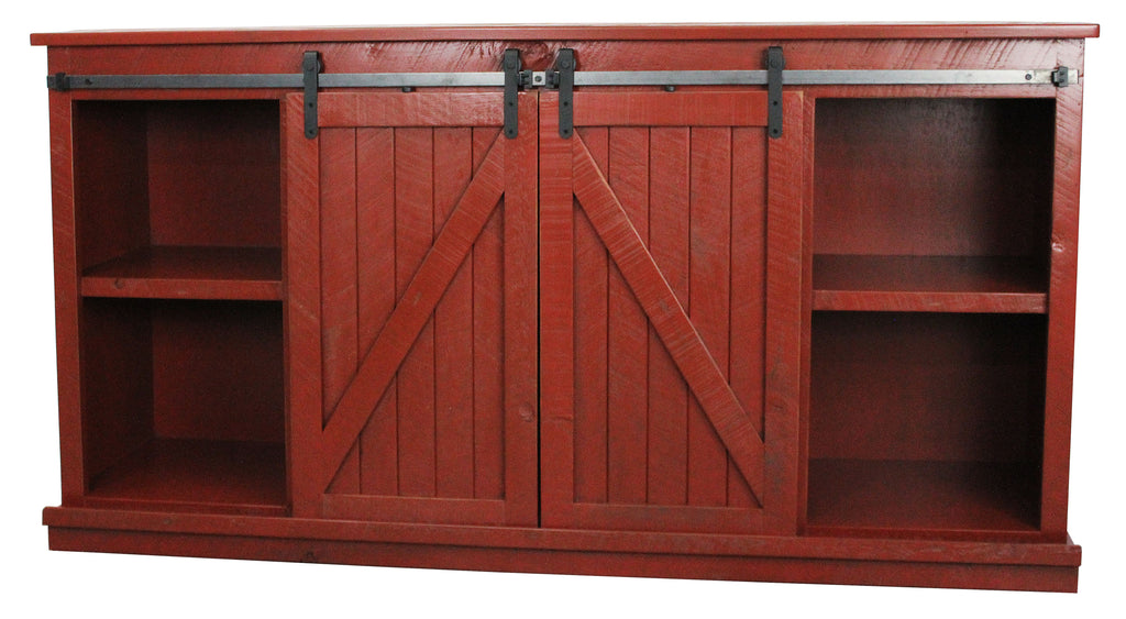 The TV stand features a rustic red finish, adding a warm and inviting touch to any room.