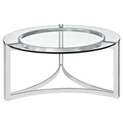 The coffee table features a round tempered glass top and a polished stainless steel base, ensuring durability and a modern aesthetic.