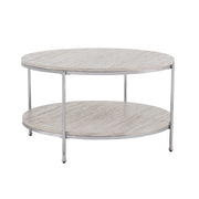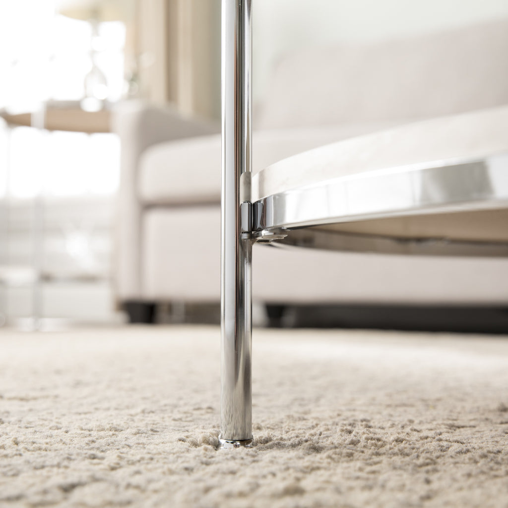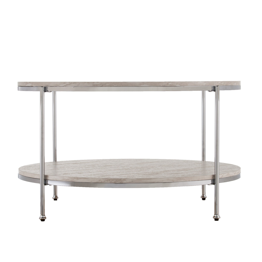 The table features a faux travertine top and a chrome finish, providing a stylish and modern look.