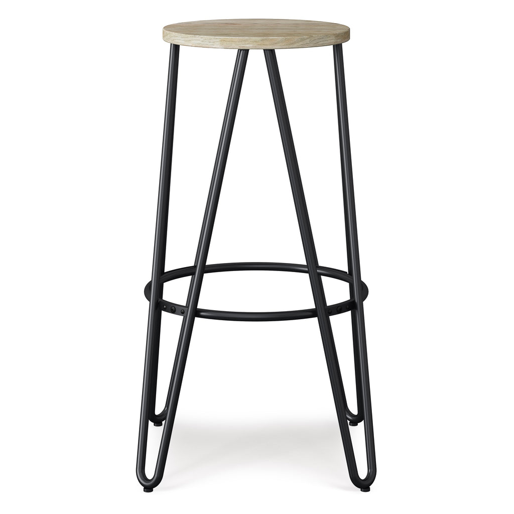 The bar stool is constructed using high-quality solid elm wood for the seat and iron tubing for the legs.