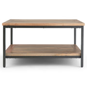 The SIMPLIHOME Skyler Coffee Table is available in a natural finish, complemented by a charcoal metal frame.