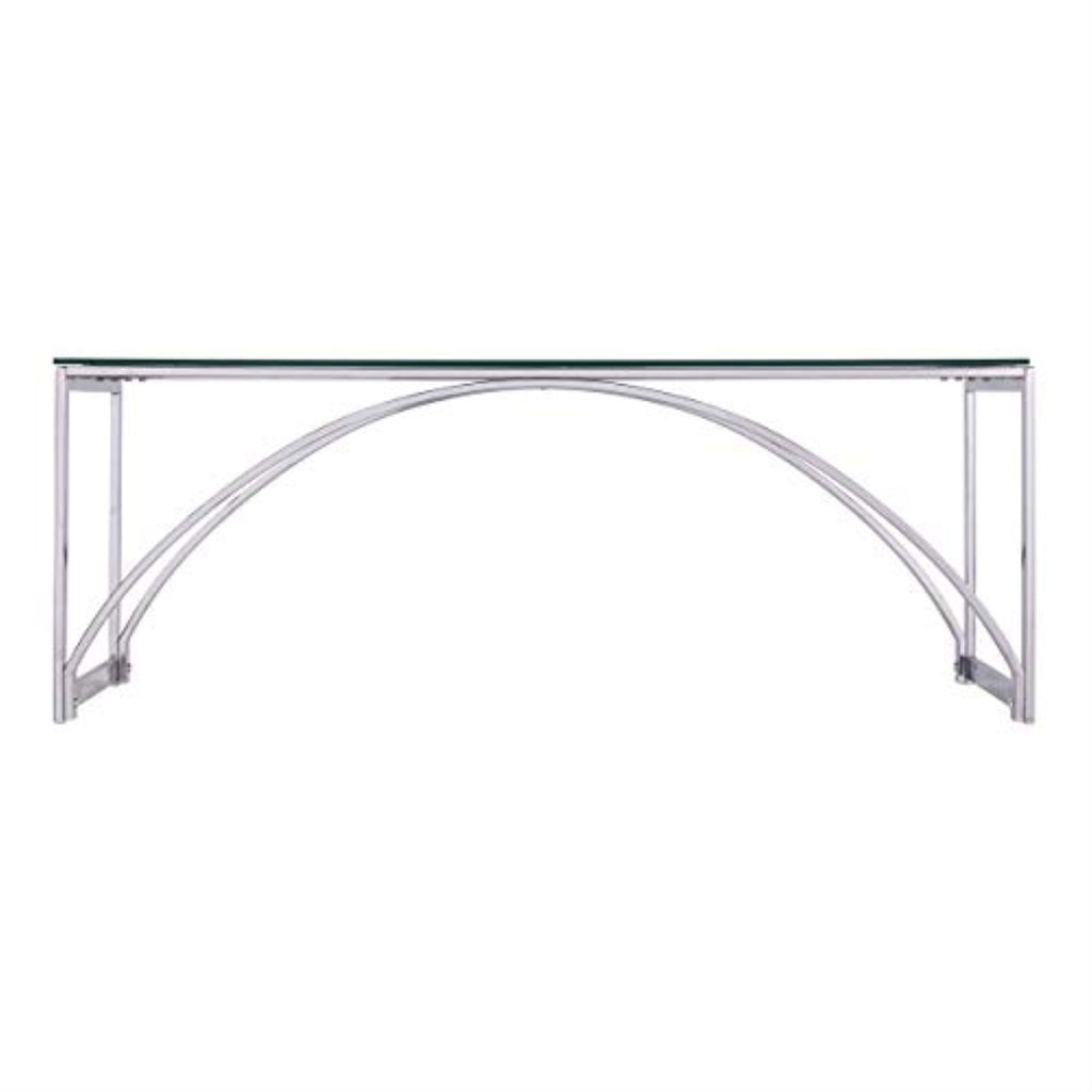 This coffee table is made with a glass top and a shiny metal frame, combining modern aesthetics with durability.